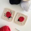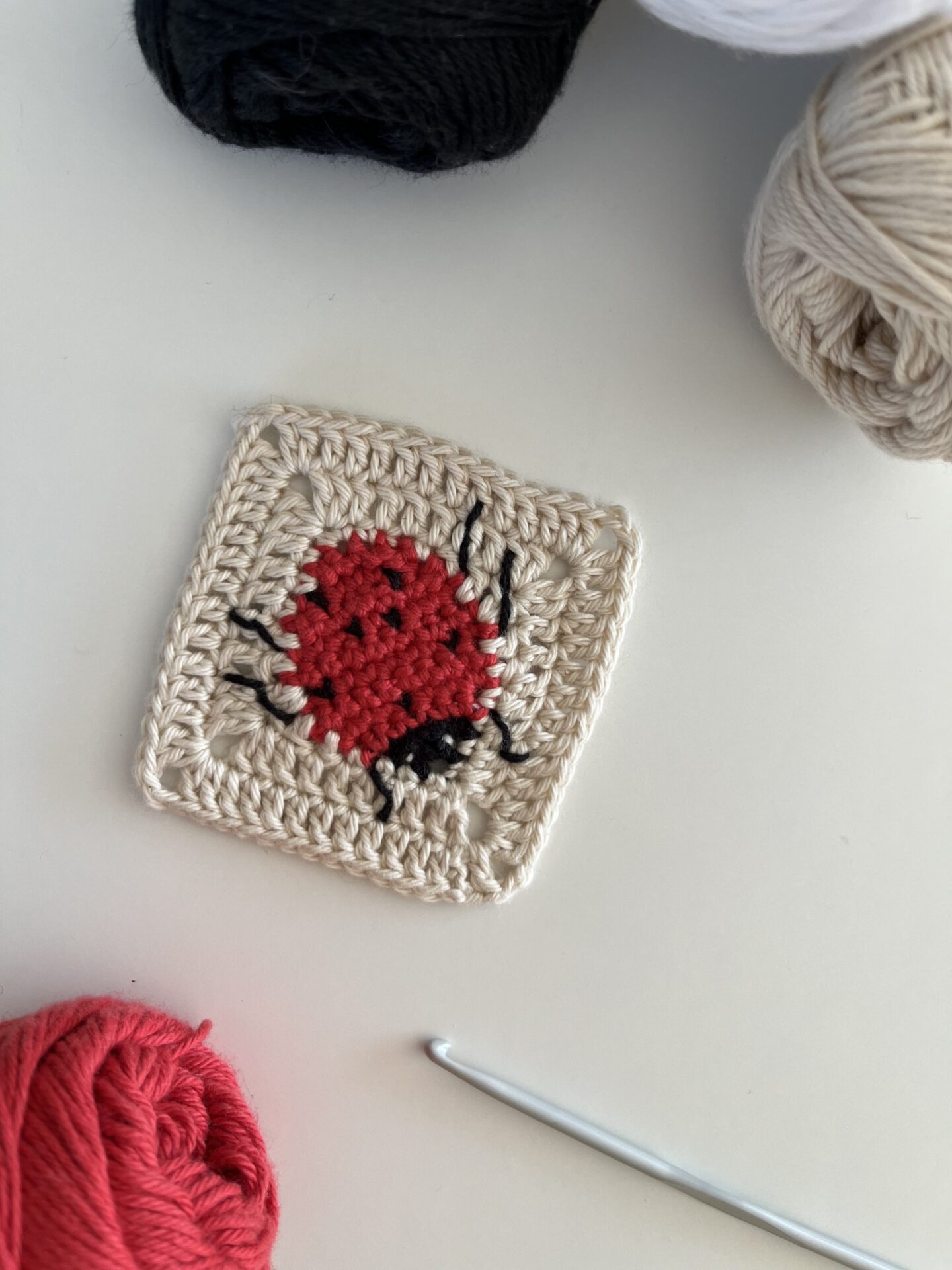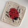 The Ladybug Square af Violi er en sød hæklet bedstemorrude med en mariehøne på. Du kan bruge bedstemorruderne til at lave The Ladybug Vest af samme designer.