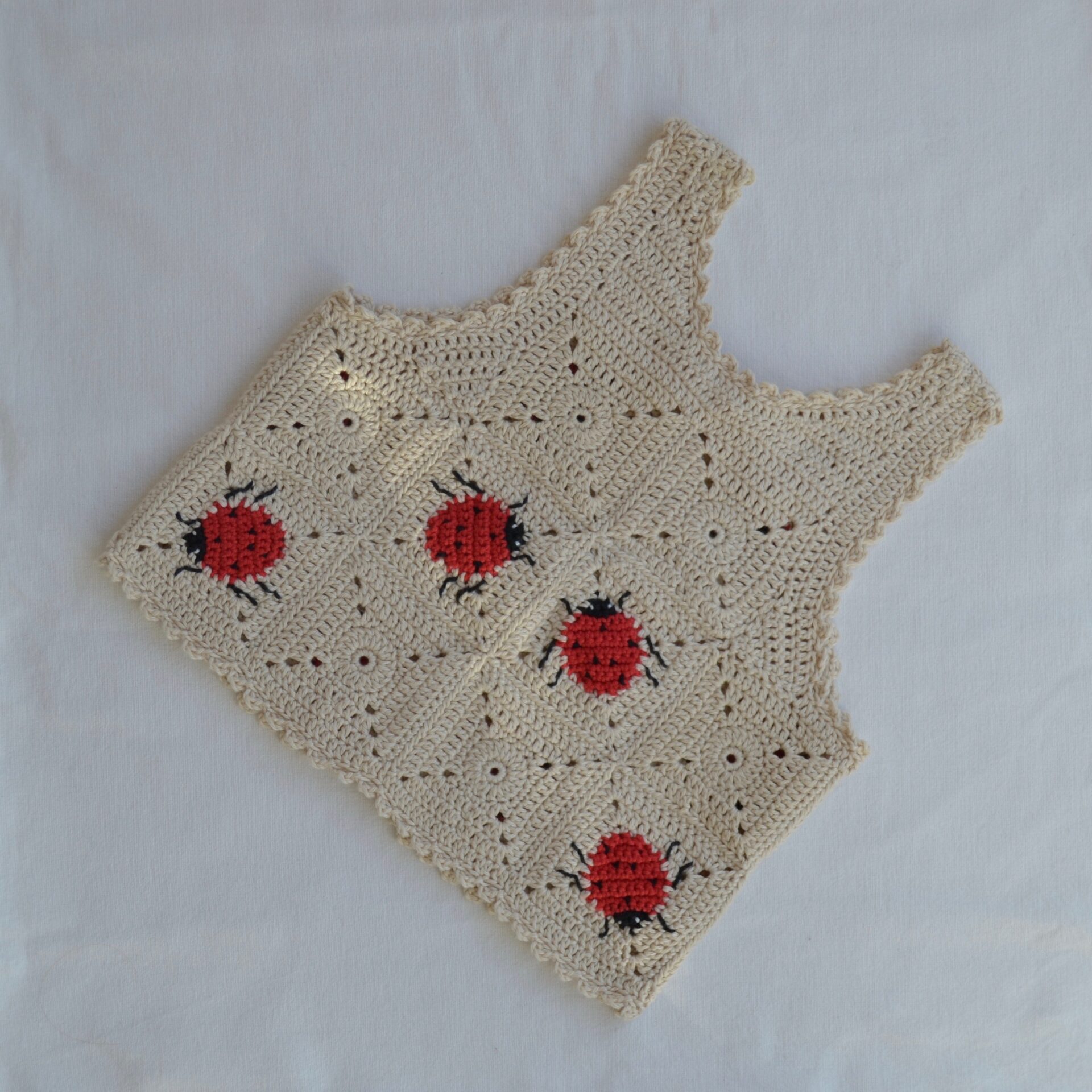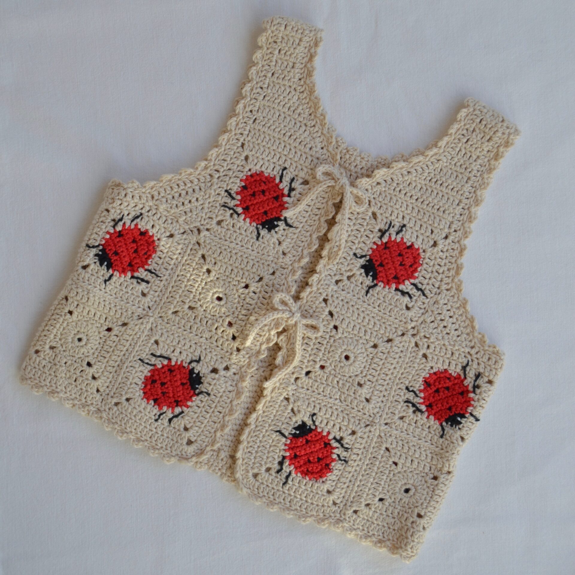 Konstruktionen er enkel: Du hækler først mariehønerne og bygger derefter bedstemorfirkanten rundt om hver mariehøne. Herefter samles firkanterne til for- og bagstykke (10 mariehøne-firkanter og 10 uden mariehøner), og der hækles eller sys sammen efter diagrammet. Skulderstropper og kanter hækles direkte på for en pæn og holdbar finish. Afslutningsvis kan du hækle fire snore (ca. 14 cm) til lukning foran – en sød detalje, der samtidig gør vesten justerbar.