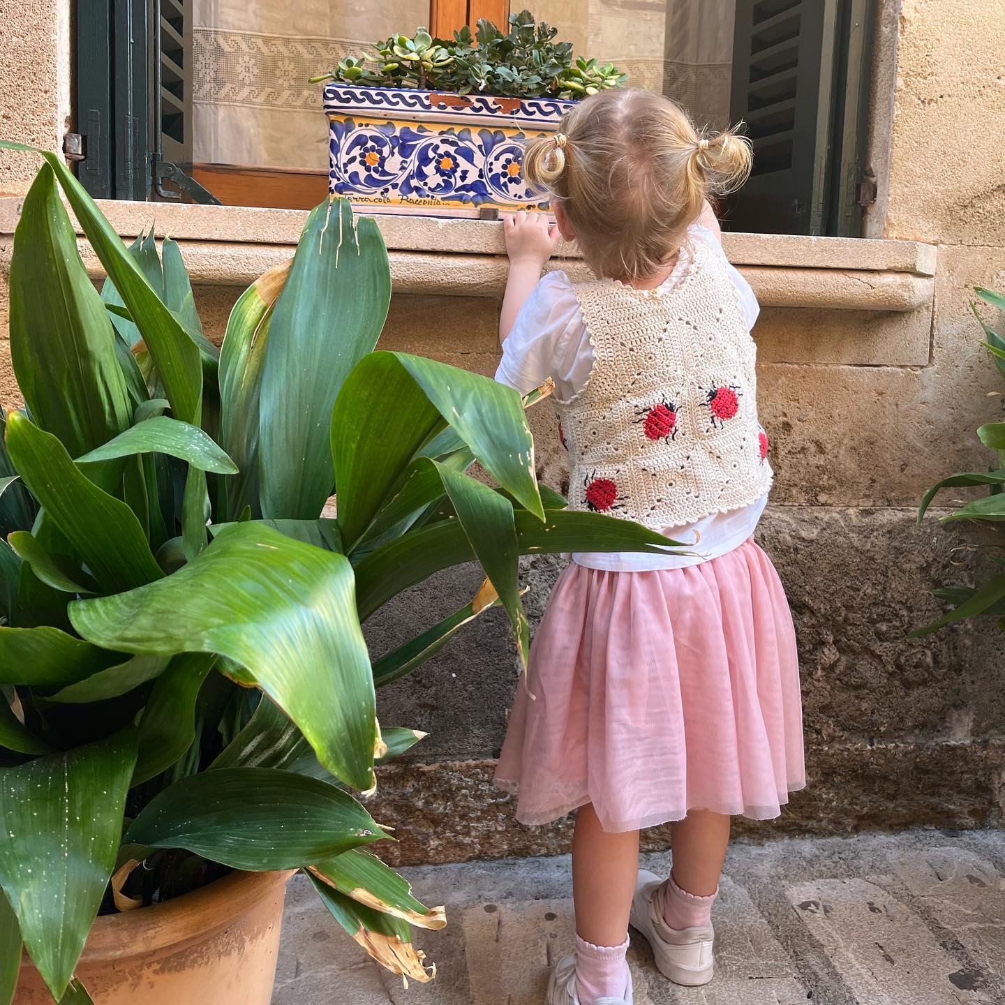 The Ladybug Vest er en sød, hæklet børnevest designet af Violi – perfekt til små naturentusiaster, der elsker mariehøner. Vesten bygges op af bedstemorfirkanter, hvor ti af dem har en hæklet mariehøne i midten. Det giver et legende, grafisk udtryk og en god, fast struktur, som holder formen pænt. Opskriften dækker tre størrelser: 0–1 år, 2–3 år og 4–5 år, med ca. brystmål 49 (60) 71 cm og længde 24,5 (30,5) 36,5 cm. Der hækles på nål 3,5 mm, hvilket sikrer et fint og tæt maskebillede, der egner sig perfekt til bomuldsgarn.