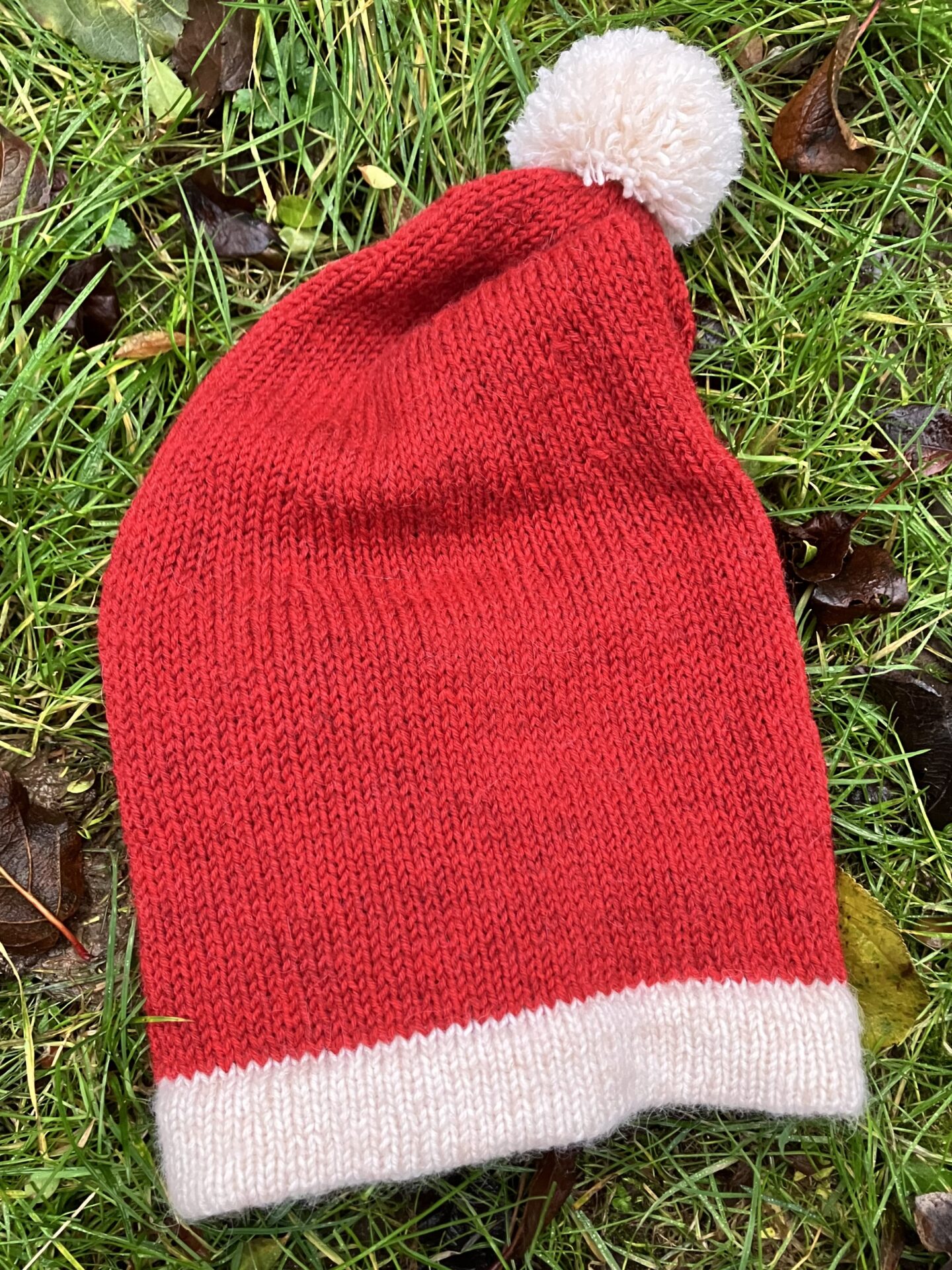 Huen strikkes i glatstrik med både rundpind 3,5 mm og 4,5 mm (40 cm), samt strømpepinde eller lang rundpind til de afsluttende indtagninger. Den anbefalede strikkefasthed er 19 masker pr. 10 cm på pind 4,5 mm efter vask, hvilket sikrer et jævnt og professionelt udtryk. Den dobbelte kant foldes ned og strikkes sammen for ekstra varme om ørerne, og toppen afsluttes med en sød pom-pom – selvfølgelig i klassisk julehvid.