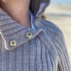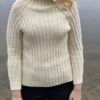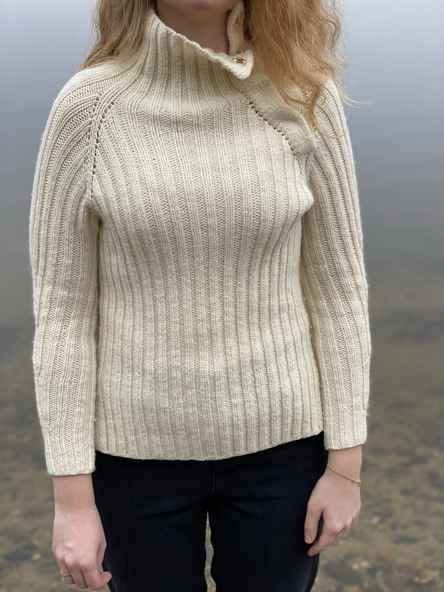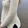 The Ocean Sweater af BelongsToMyMom er ribstrikket raglansweater strikket oppefra og ned med en stor krave, der kan knappes helt op.