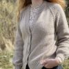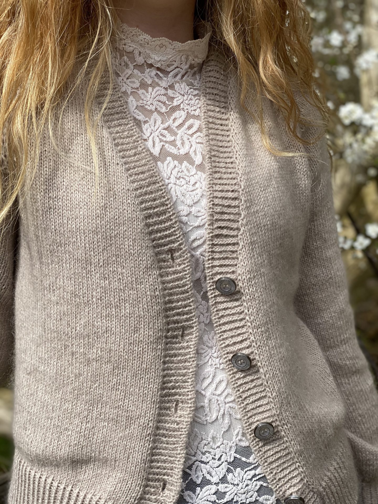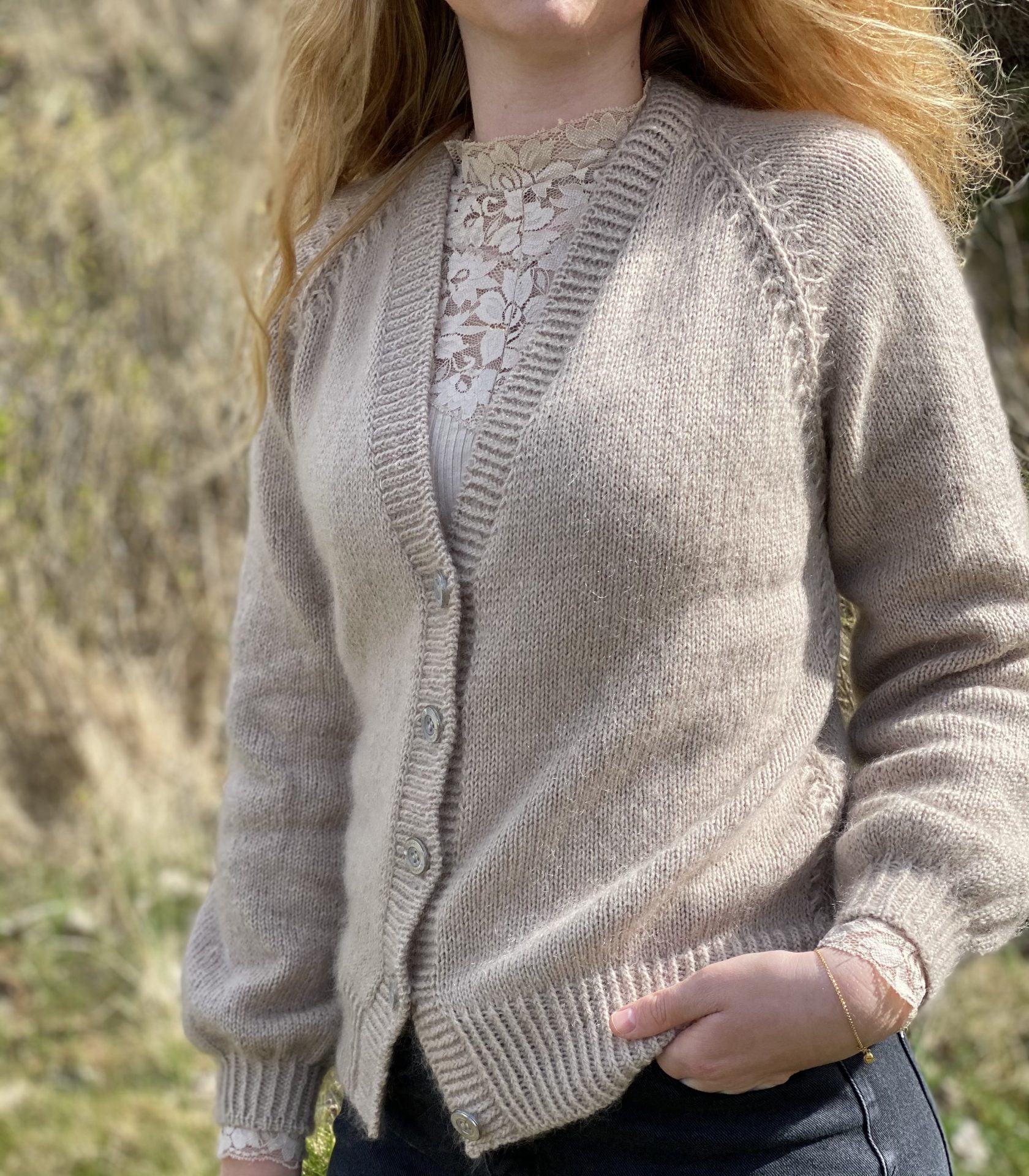 Denne cardigan strikkes oppefra og ned, hvilket giver mulighed for at prøve undervejs og tilpasse længde på både krop og ærmer. Modellen er konstrueret med raglanudtagninger, som giver et flot fald og en god pasform. Kroppen strikkes frem og tilbage, mens ærmerne strikkes rundt med magic loop. Til sidst samles masker op til den smukke knaphulsstolpe, som strikkes i en drejet rib, der sikrer et eksklusivt finish.