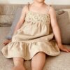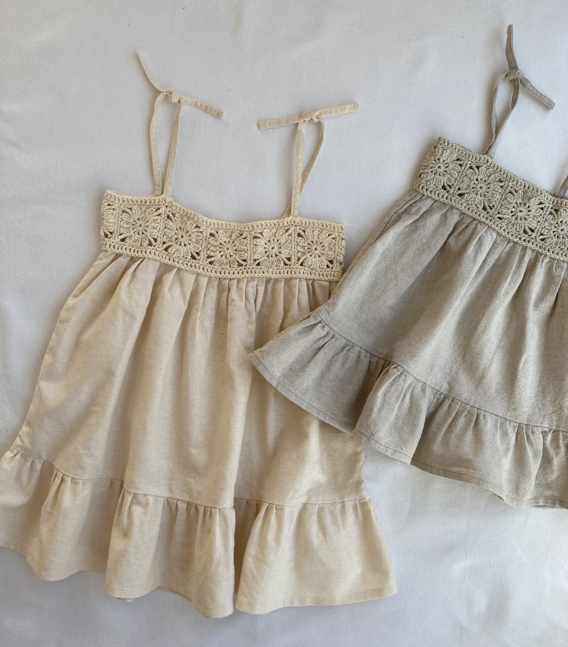 The Strap Dress no 1 er designet af Violi til de mindste. Det er en fin syet kjole med et overstykke der laves af hæklede bedstemorruder.