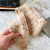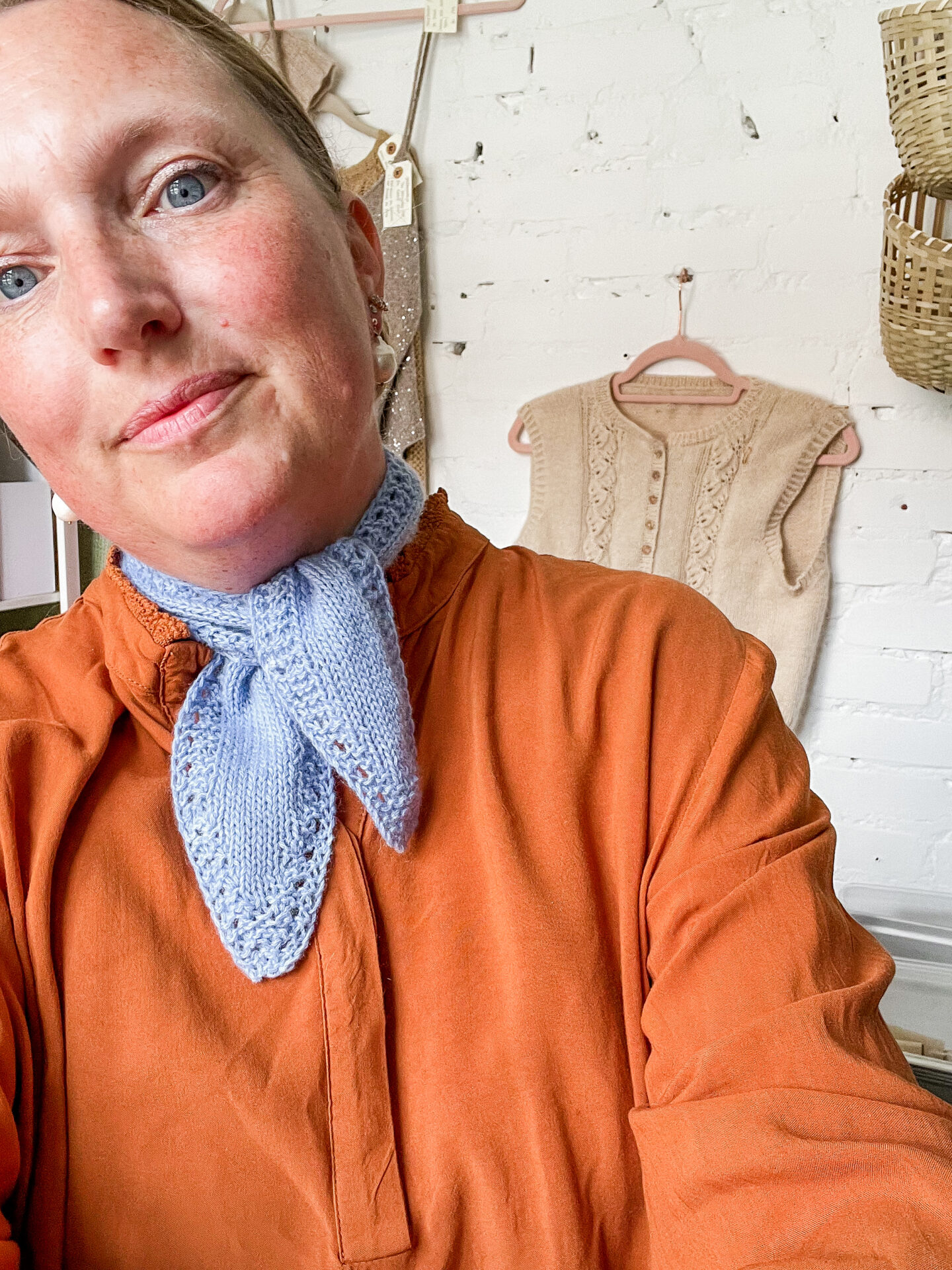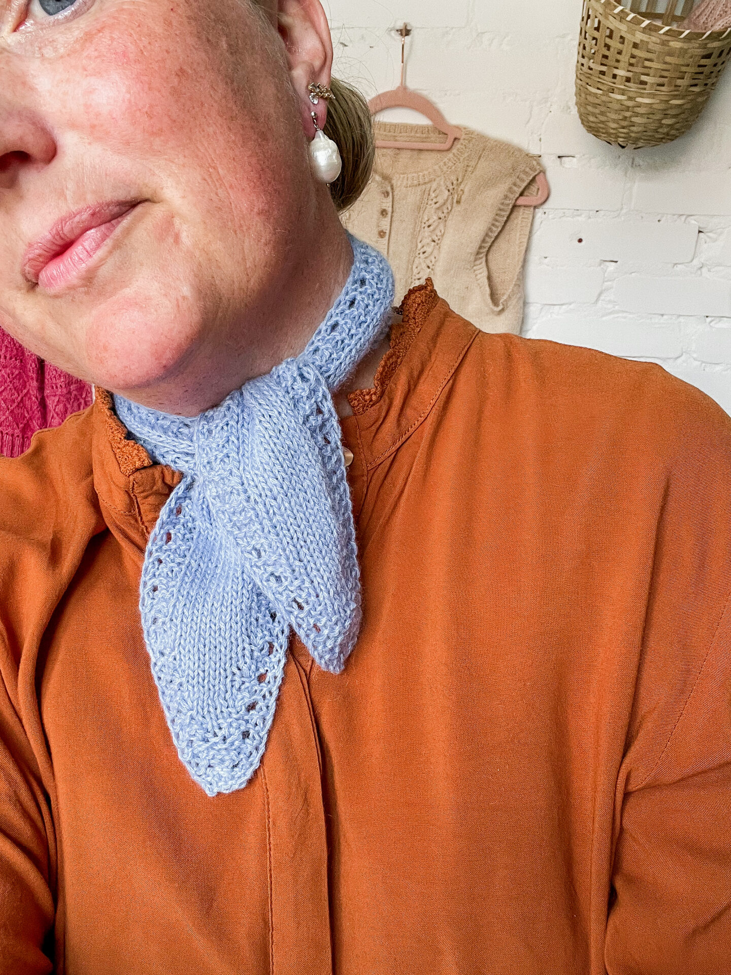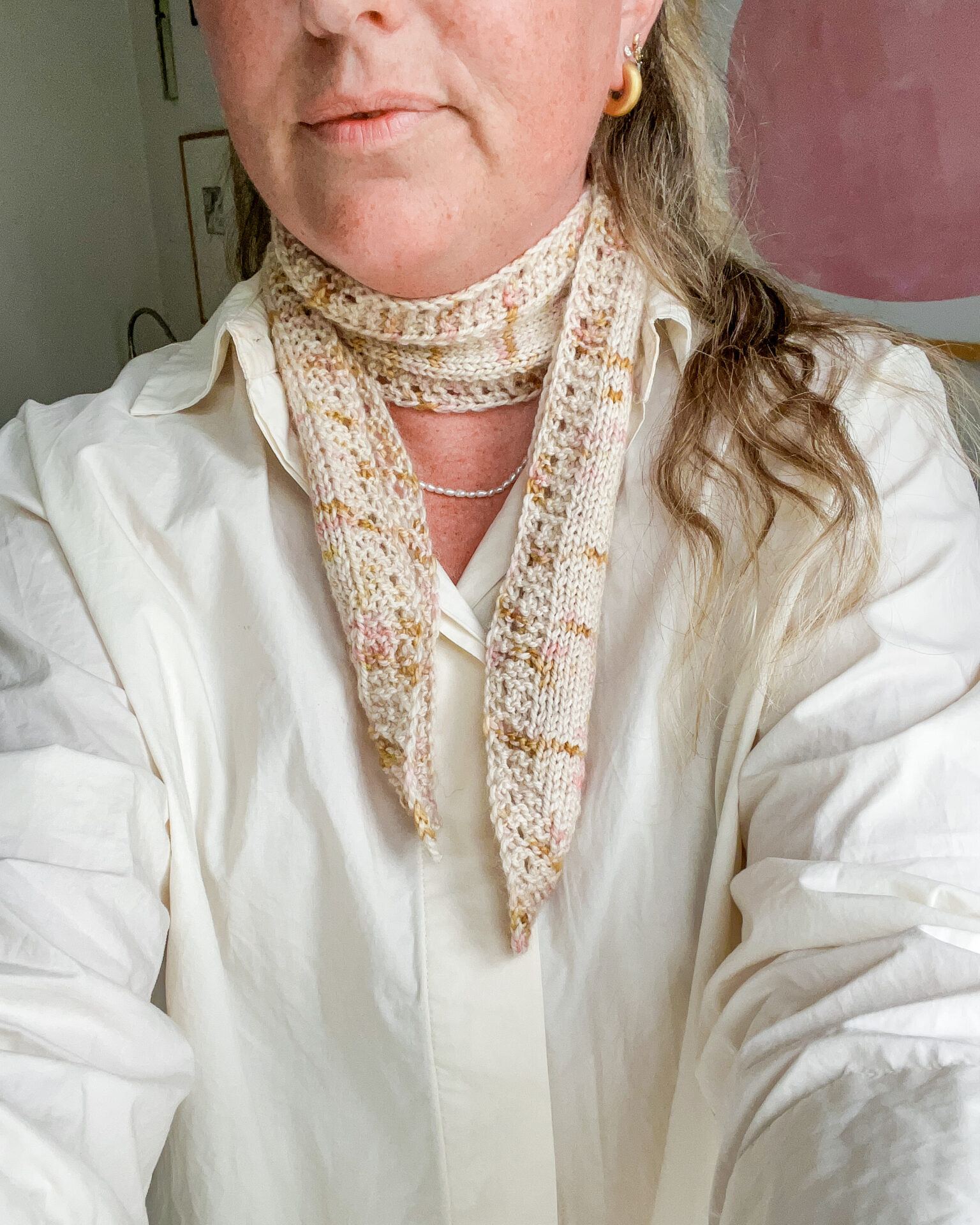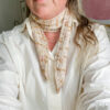 Tiny Bow Scarf af Dorte Bak er et fint og feminint tørklæde med hulmønster og spidse afslutninger, for et elegant look, når tørklædet bindes som en sløjfe.