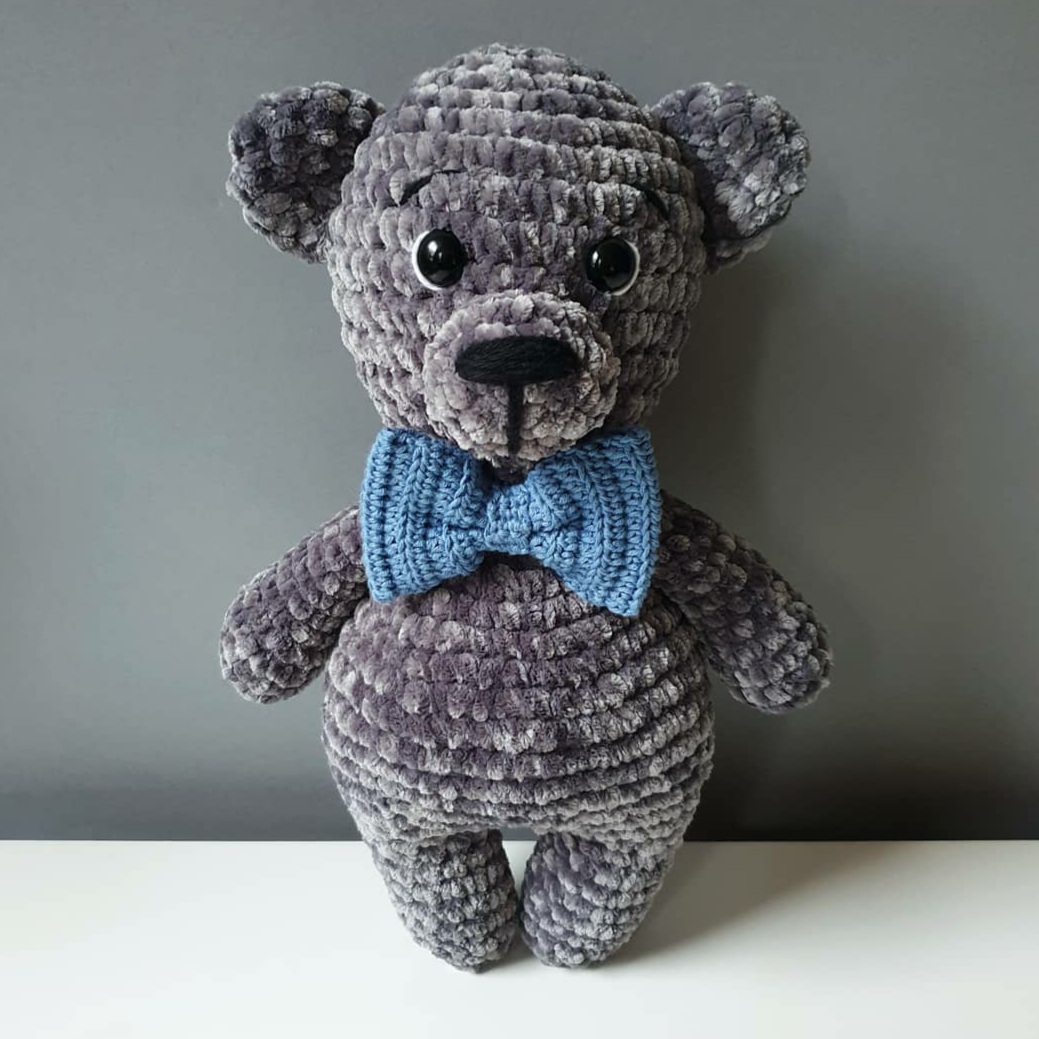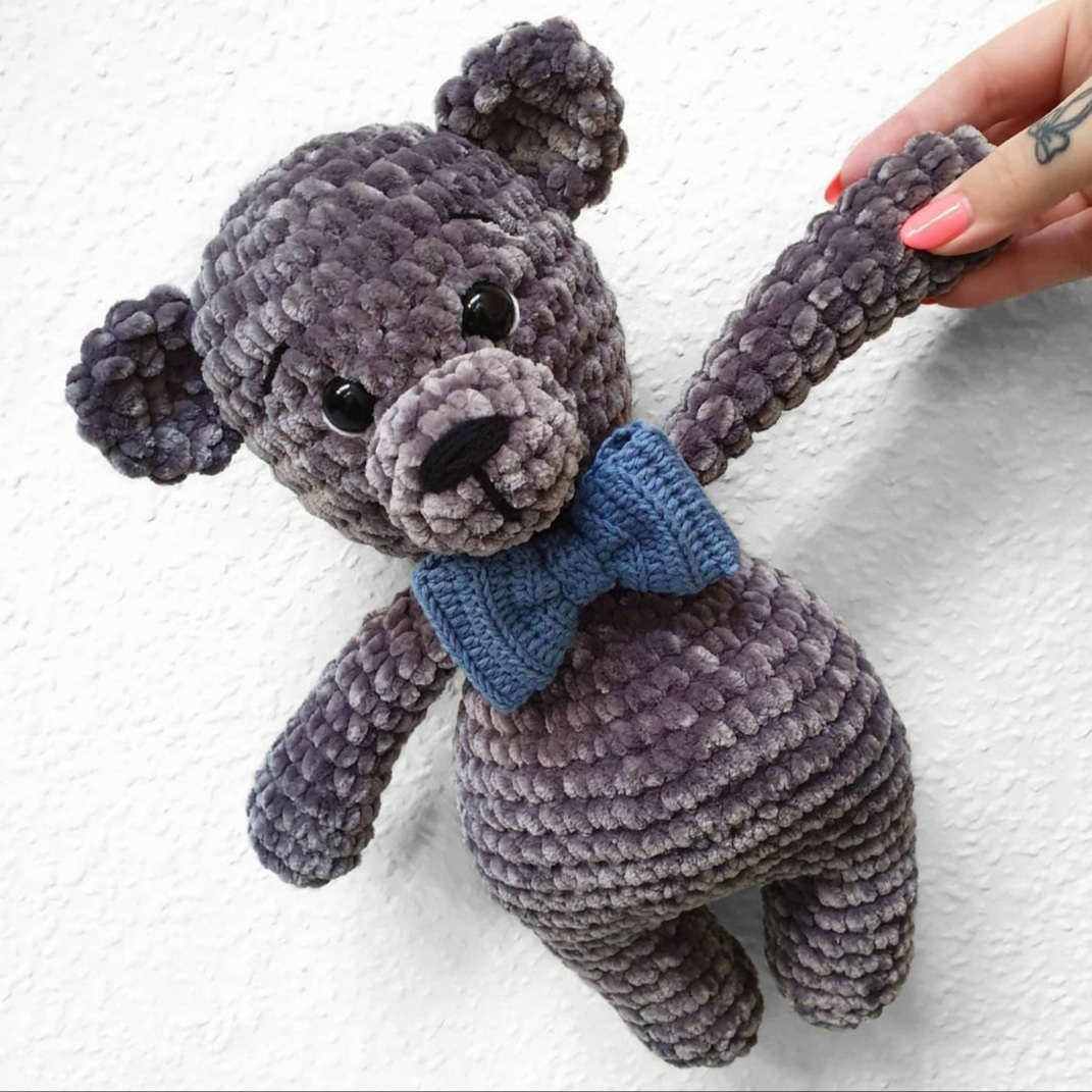 Velourbamsen er hæklet i noget blødt velourgarn som er med til at give bamsen dens bløde udtryk. Til den søde bamse, er der i opskriften også beskrivelser på et hårbånd og en butterfly som tilbehør.