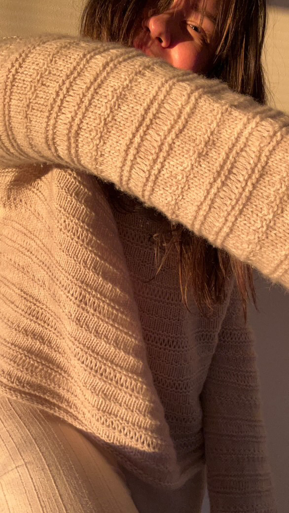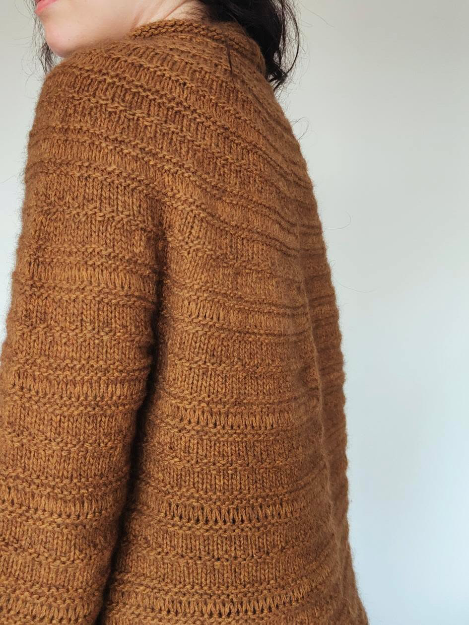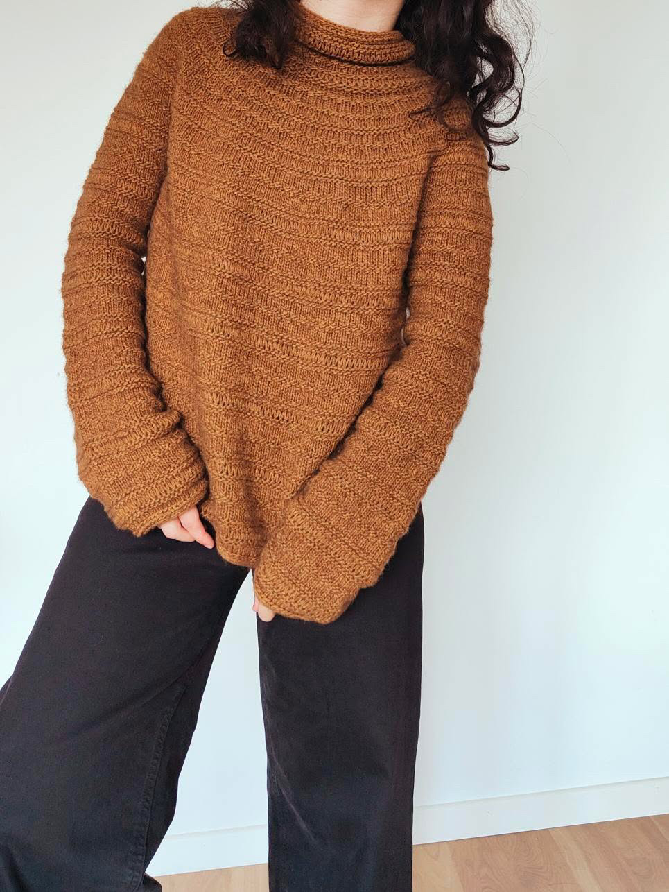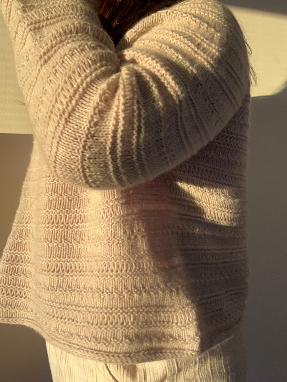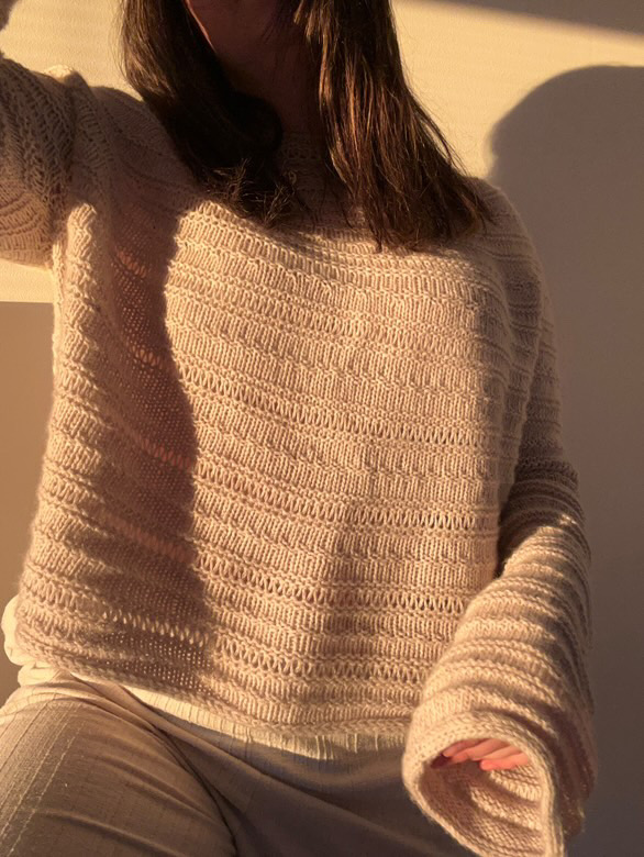 Arbejdet strikkes rundt med mønster over 18 omgange, som gentages gennem hele sweateren. Både krop og ærmer strikkes i ét sammenhængende forløb, hvilket giver mulighed for let tilpasning undervejs. Sweaterens længde ændrer sig betydeligt efter vask og blokning, hvilket gør det muligt at opnå den perfekte pasform ved at tilpasse længden mod slutningen af projektet.