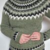 The pattern is worked in Ístex Léttlopi, a classic Icelandic yarn that combines warmth, durability, and breathability. Léttlopi comes in 50 g skeins with a length of 100 m, which equals 100 m per 50 g. The recommended colors are Green 9421 as the main shade (colour A), White 0051 as the contrast (colour B), and Black 0059 (colour C). The sweater is available in sizes XXS to 5XL, covering chest widths from 71 cm to 140 cm, body lengths from 30 cm to 46 cm, and sleeve lengths from 42 cm to 52 cm depending on size.