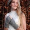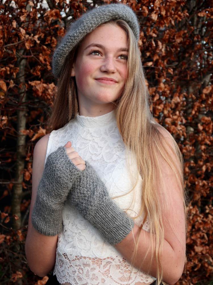 tilhørende halstørklæde og halvvanter fra samme serie.