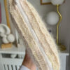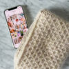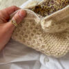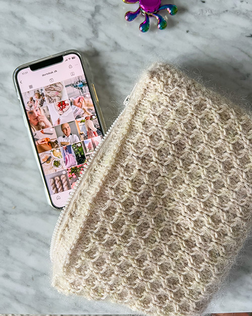 Vispa Clutch er en elegant og funksjonell liten veske som kan brukes som clutch, sminkepung eller til oppbevaring av småting som strikketilbehør. Vesken strikkes nedenfra og opp, med en solid bunn i perlestrikk som danner fundamentet for vesken. For- og bakstykket har et dekorativt bikubemønster, mens toppen er glatt og egnet for å sy inn en glidelås.