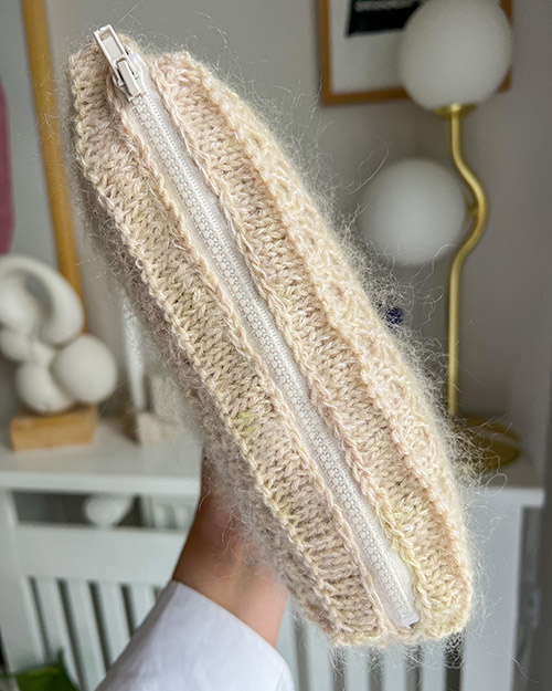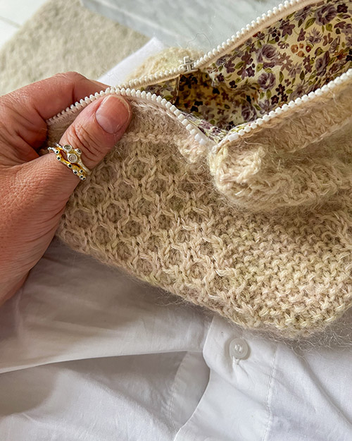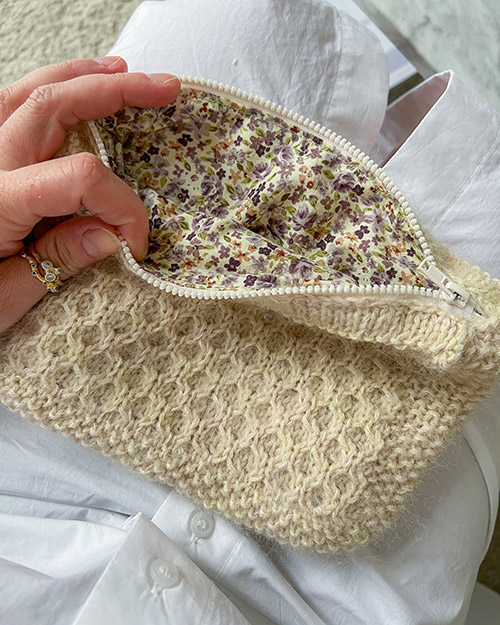 Vesken avsluttes med avfelling i toppen og kan fores med stoff og en glidelås på 20 cm – eller litt lengre ved behov etter blokking. Dette gir et profesjonelt og gjennomført uttrykk.