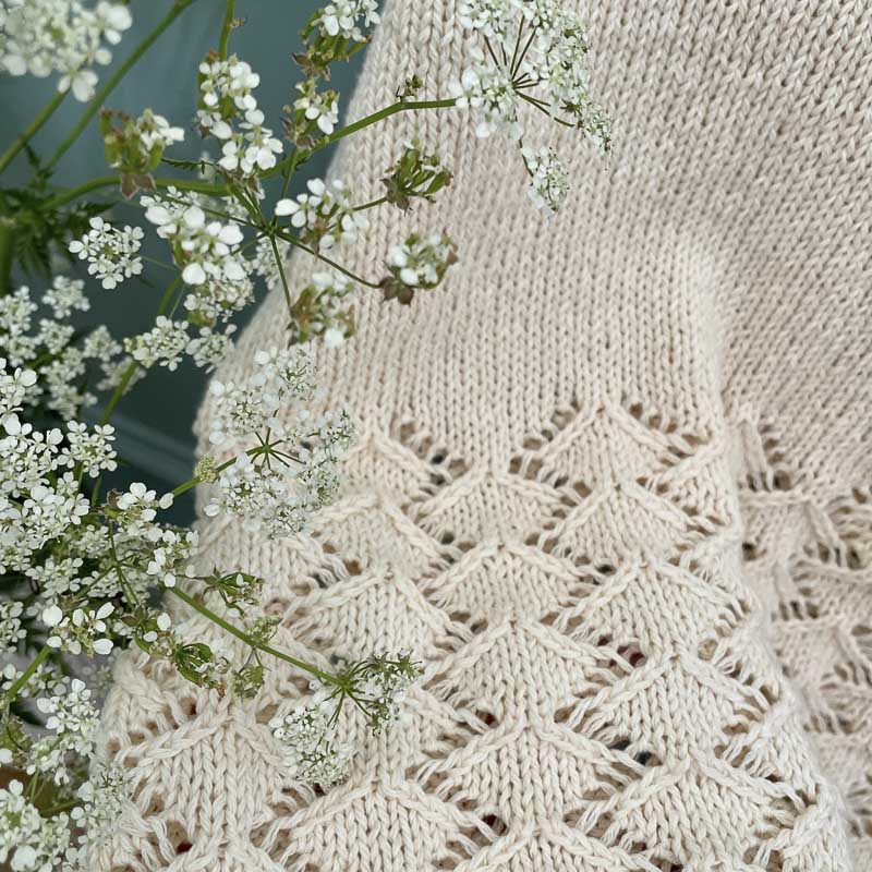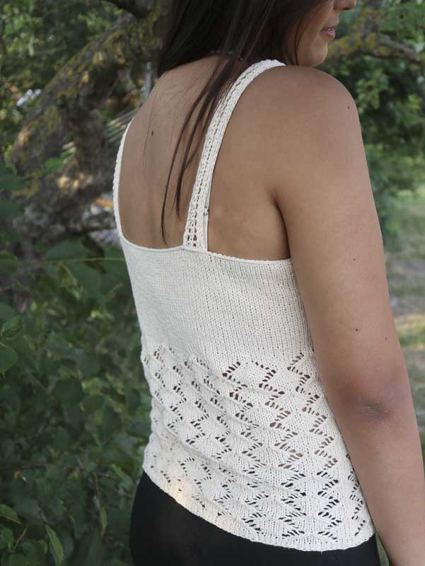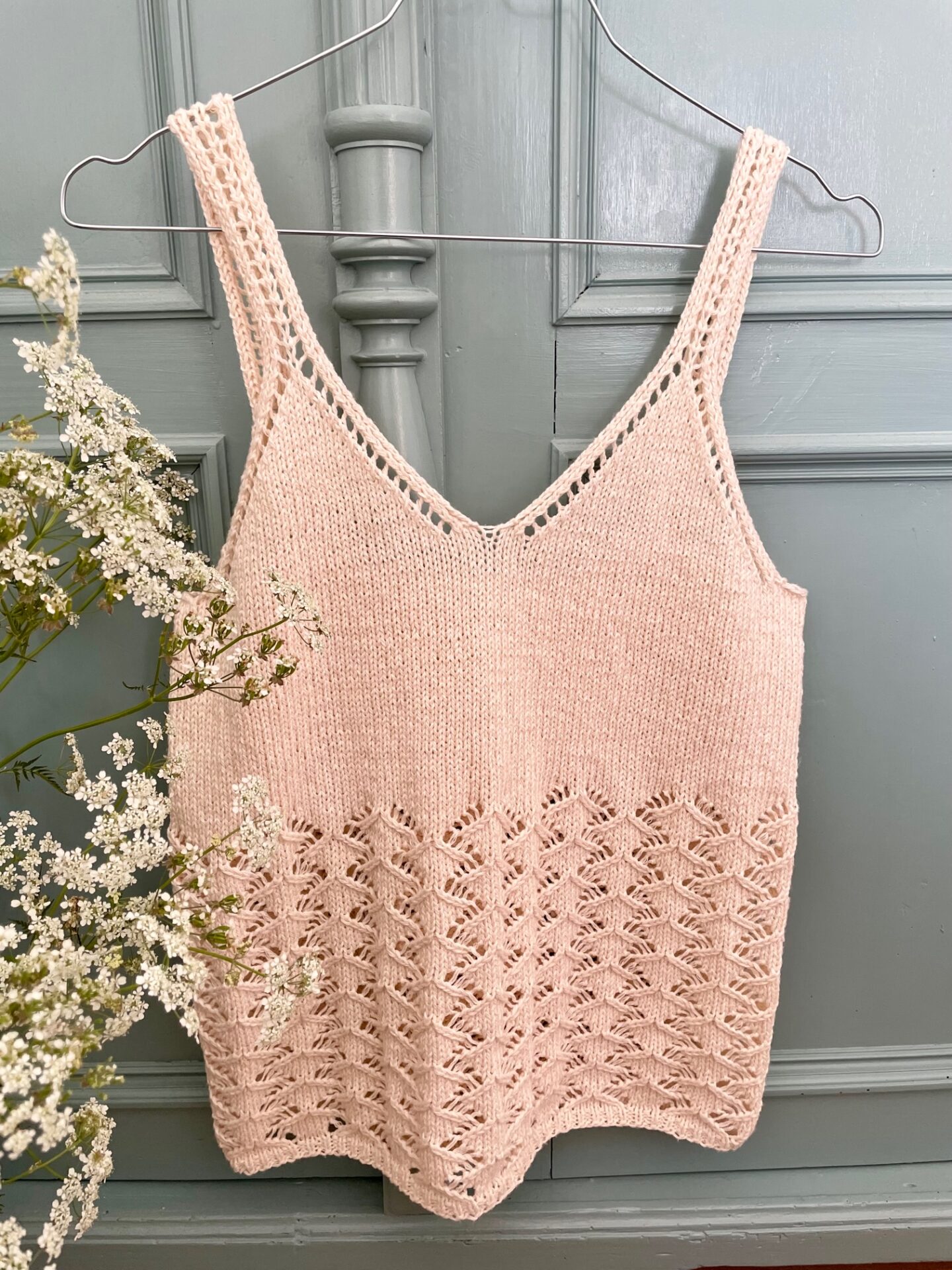 White Nights Summertop er skabt af Knitamore til de lune og lyse nætter. Det er en fin og sommerlig top med en mønsterdel nederst på kroppen, derefter et glat bærestykke med et feminint og tætsiddende snit. Toppen har det fineste stropper med hulmønster, og egner sig perfekt til nederdel eller shorts.