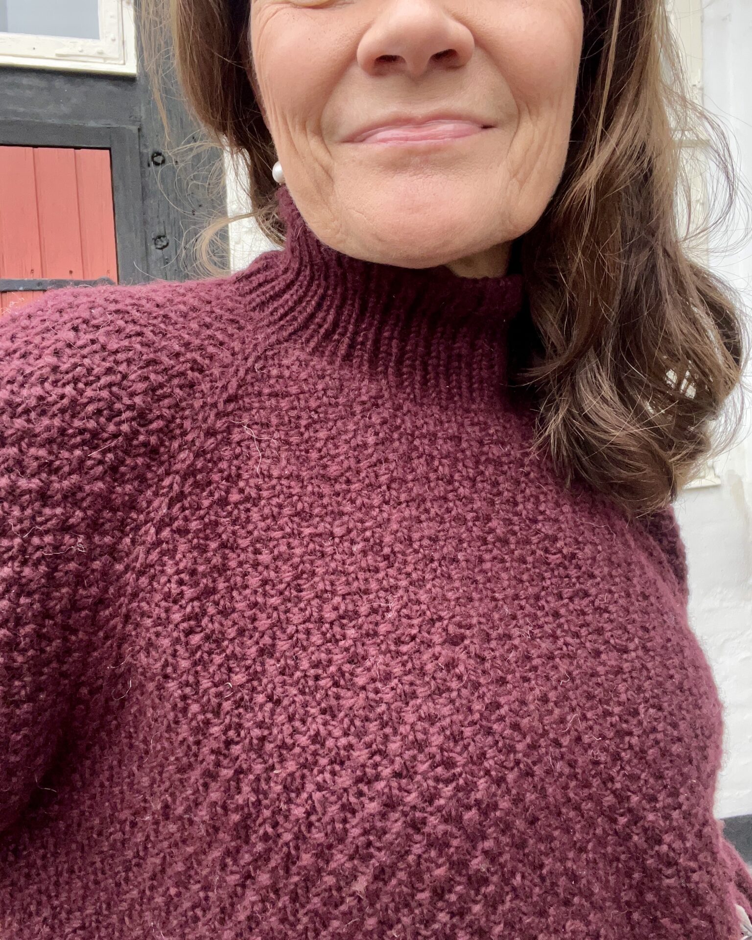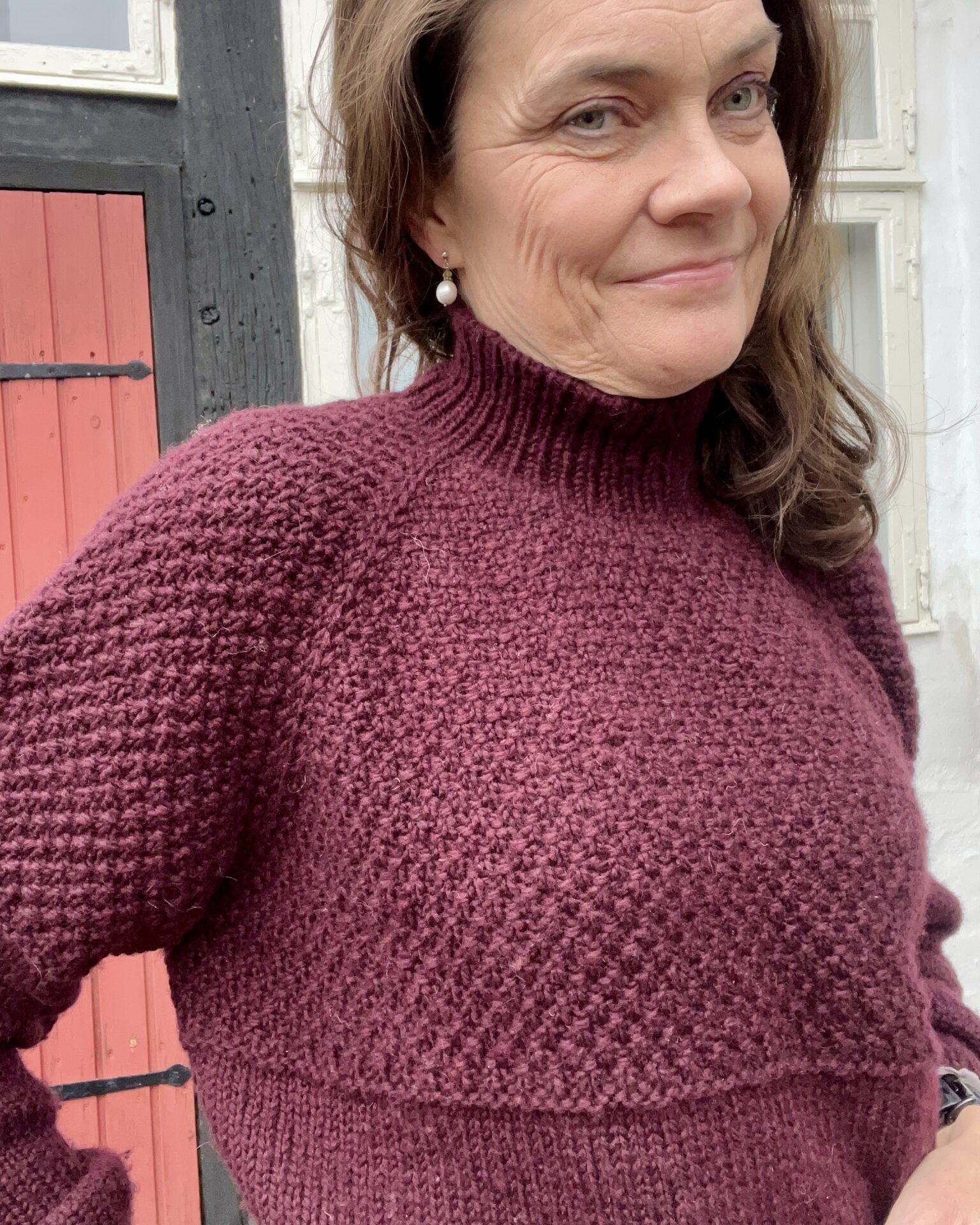 Bærestykket er strikket i dobbelt perlestrik, hvilket skaber en smuk og tekstureret overflade, mens både krop og ærmer strikkes i glatstrik for et rent og moderne udtryk. Sweaterens detaljer er gennemtænkte, herunder brug af vendepinde (German Short Rows) for at skabe en god pasform ved halsudskæringen samt raglanudtagninger for en flatterende skulderlinje.