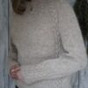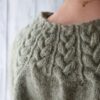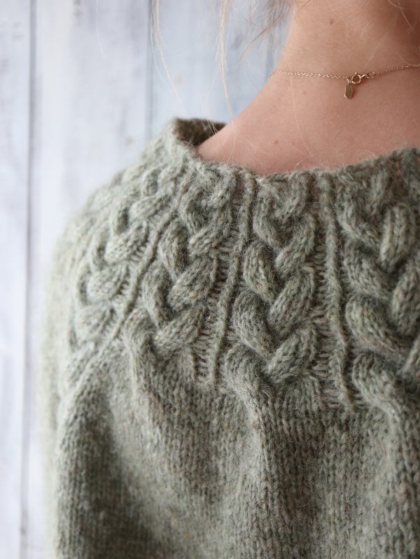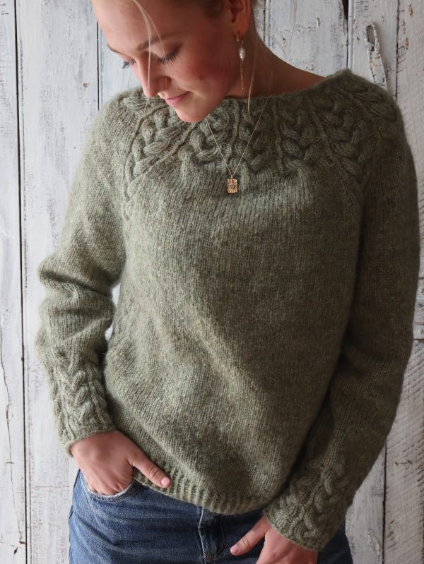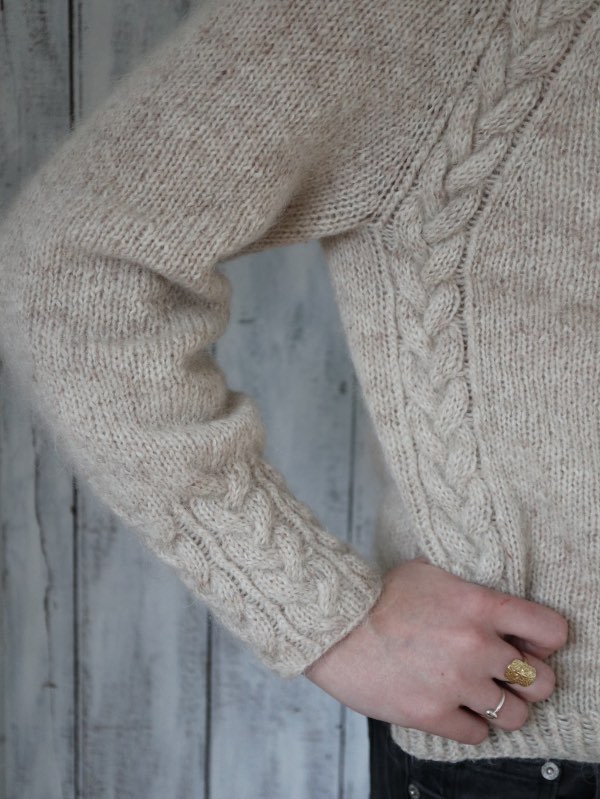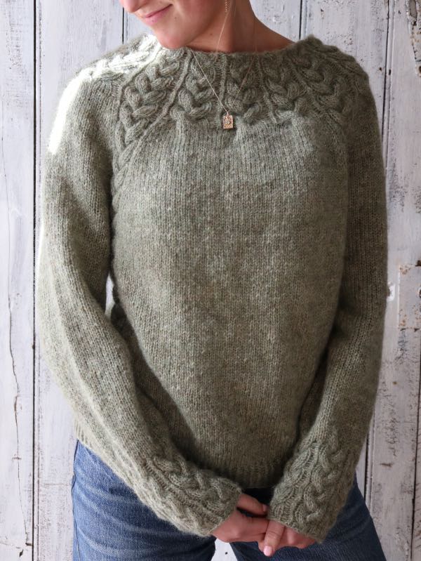 Opskriften er gennemarbejdet med tydelige udtagninger omkring fire raglanbjælker og løbende snoninger, som former pasformen. Kroppen strikkes i glatstrik med to kabler i hver side og afsluttes med drejet rib forneden; ærmerne strikkes lige ned og slutter med snoninger hele vejen rundt. Modellen er monteringsfri. Strikkefasthed: 17 m × 29 p i glatstrik på pind 4,5 mm = 10 × 10 cm (lav strikkeprøve). Vejledende pinde: rundpind 4,5 mm (60/80/100 cm og evt. 40 cm til ærmerne) samt 3,5 mm til aflukning ved ærmerne.