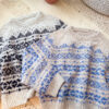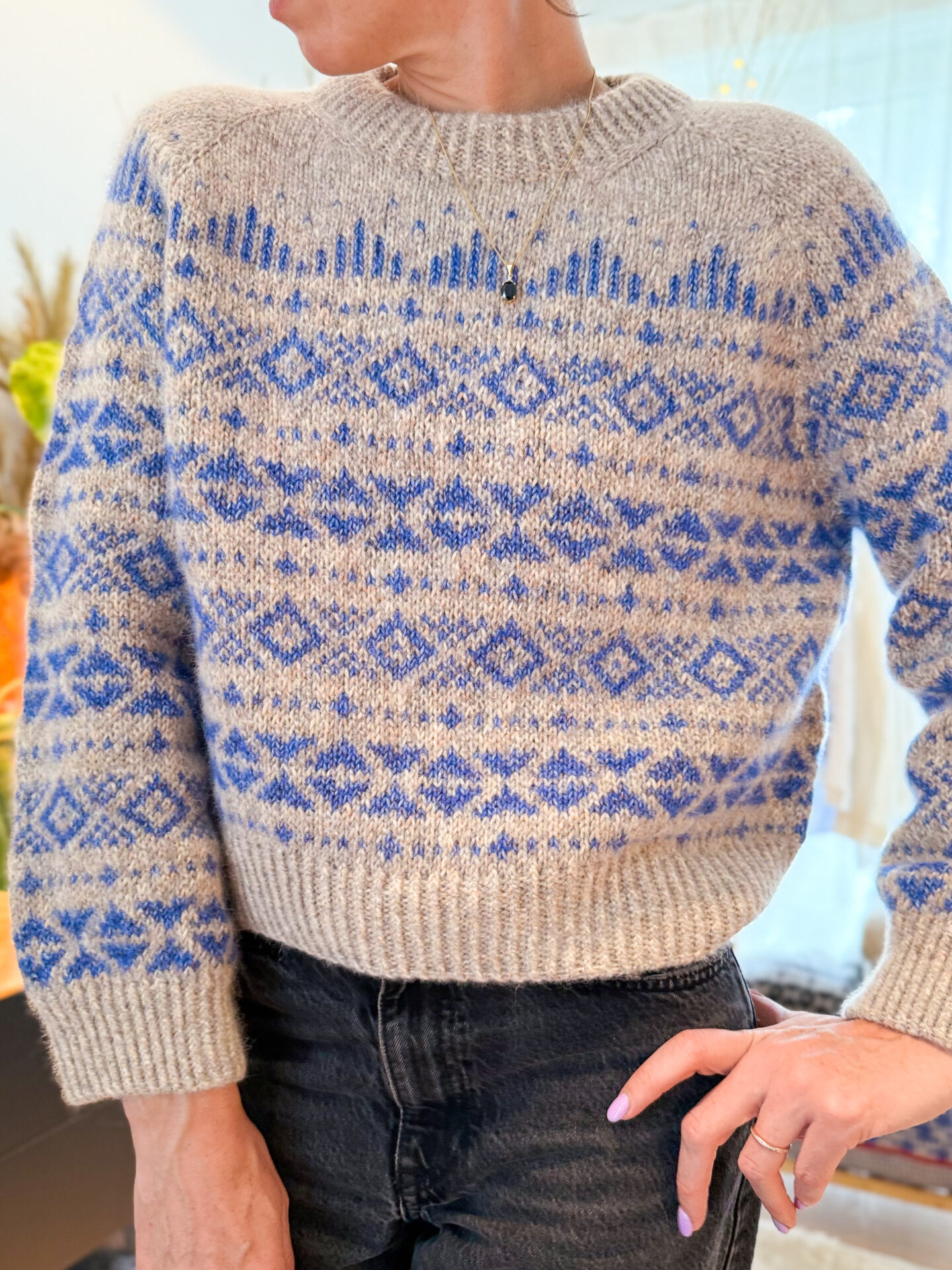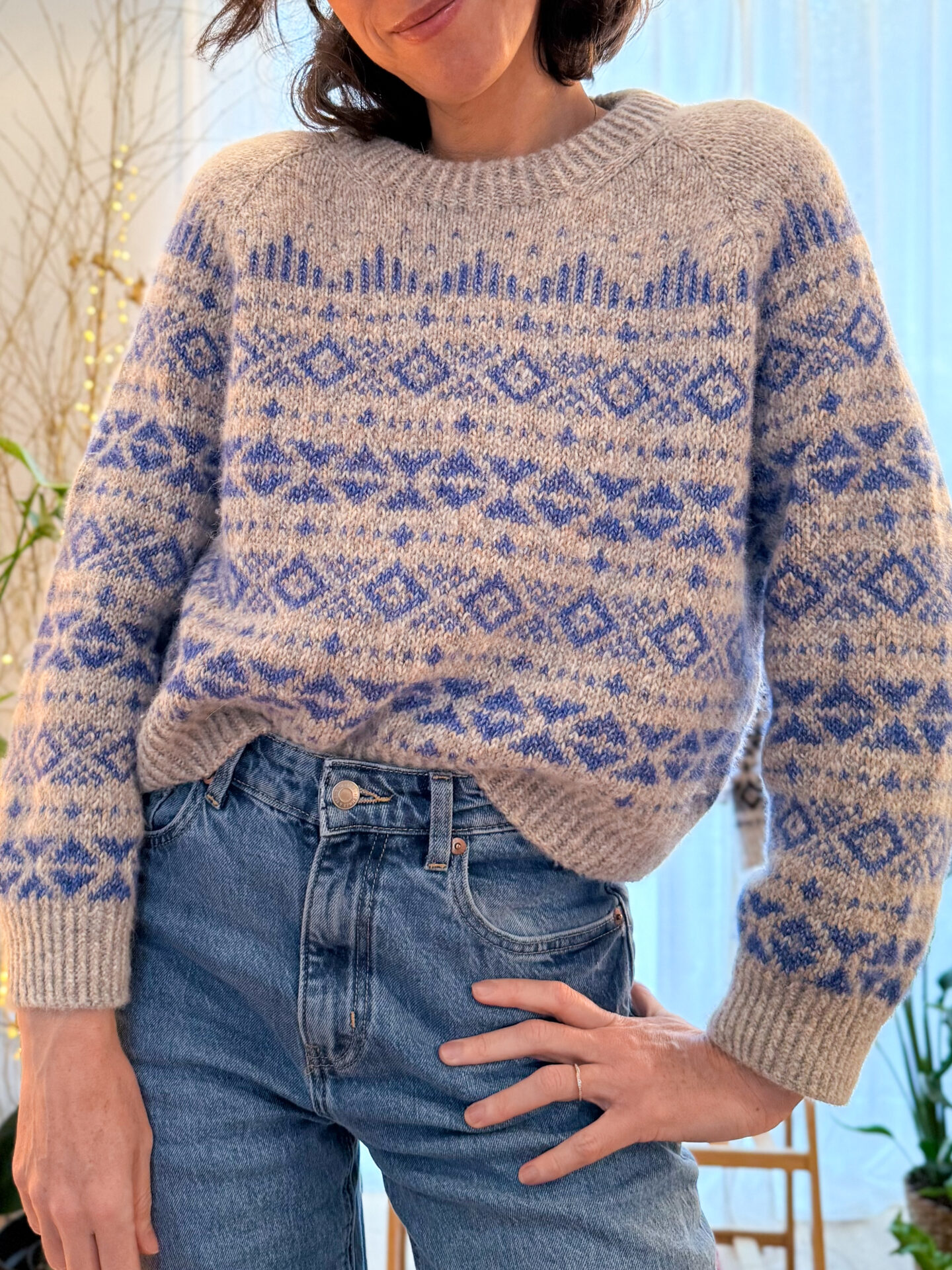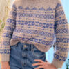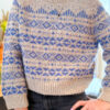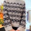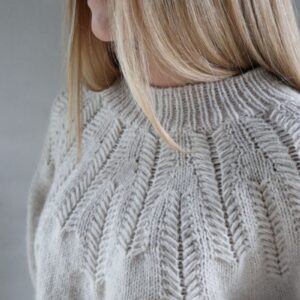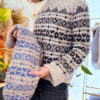 Body and sleeves are worked in continuous rounds in stockinette and stranded motifs, with underarm stitches cast on using the backward-loop method to create a seamless transition. The sleeves are finished to a straight silhouette with wide twisted-rib cuffs, and the hem mirrors this clean structure. The neckline is picked up and worked in a twisted rib before being folded double and sewn down from the inside for a perfectly structured edge.